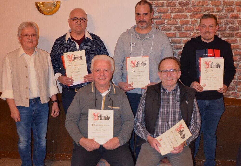 Geehrt wurden dann zwei aktive und acht fördernde Mitglieder für ihre langjährige Vereinsmitgliedschaft. Fünf fördernde Mitglieder hatten sich entschuldigt und bekommen ihre Urkunden später überreicht. Aktive: Sven Arnold (10 Jahre), Jörg Müller (35 Jahre); Fördernde: Volker Buß (50 Jahre), Heinz Pötzl und Werner Faber (jeweils 60 Jahre), nachgereicht werden Urkunden an Rolf Bingel (25 Jahre), Klaus Trotz, Walter Müller (55 Jahre), Josef Rotter, Josef Thiel (65 Jahre).