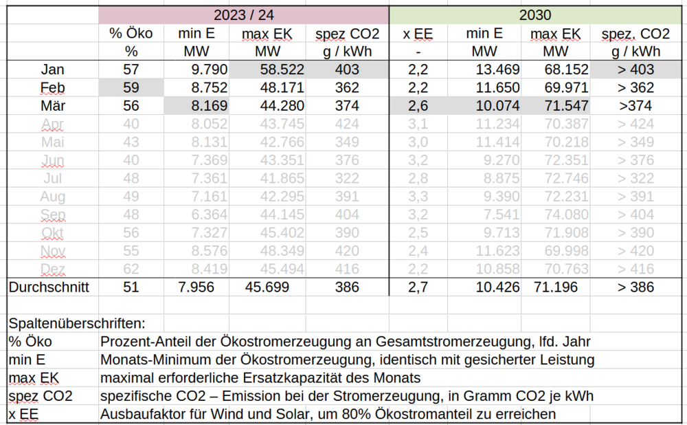 Die Tabelle zeigt in normaler Schriftstärke die Ergebnisse aus dem laufenden Jahr 2024. Das vergangene Jahr bleibt abgeschwächt mit dargestellt und wird mit den aktuellen Monatsdaten überschrieben. Das erlaubt eine direkte, sichere Prognose für das Gesamtjahr, deren Genauigkeit vom saisonal geprägten Ähnlichkeitsgrad beider Jahresverläufe abhängt. Kritische Werte, wie die gesicherte Leistung, die maximale Ersatzkapazität (max EK) und der spezifische CO2 – Ausstoß werden in jedem Monat als graue Felder hervorgehoben. Der max EK – Wert ist zeitlich nicht prognostizierbar und muss daher, um vollständige Bedarfsdeckung zu garantieren, rechtzeitig mit grundlastfähigen regelbare Kraftwerksreserve vorgehalten werden.