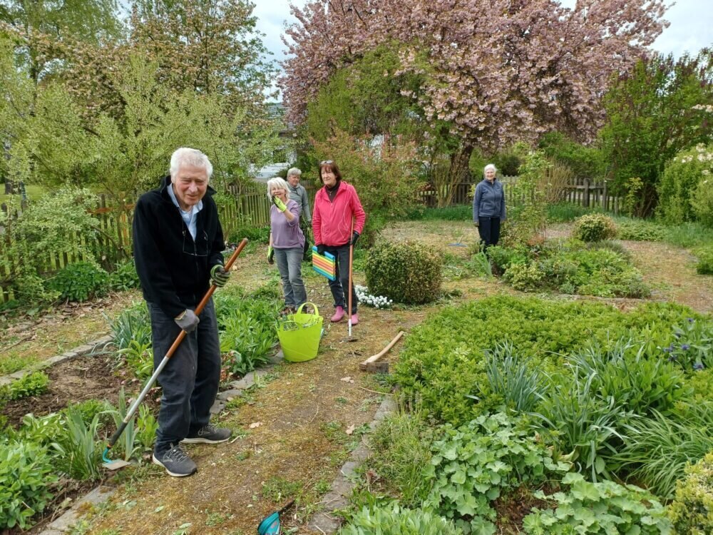 Zu ihren ersten Arbeitseinsatz in diesem Jahr kamen in der vergangenen Woche Frankenbacherinnen und Frankenbacher zusammen. Unter der Anleitung von Vereinsgärtner Hans-Jürgen Käfer wurden Büsche geschnitten und Beete und Wege vom Unkraut befreit. Für den Grünschnitt hatte der Bauhof freundlicherweise einen Container zur Verfügung gestellt. Mit dabei u.a. der Ehrenvorsitzende des Heimat- und Geschichtsvereins Ekkehardt Löw, weitere Vorstandsmitglieder und wie immer Marlies van den Brink. Nach getaner Arbeit erfreute man sich am Kaffee und dem leckeren, von Monika Schneider gebackenen Kuchen.