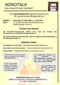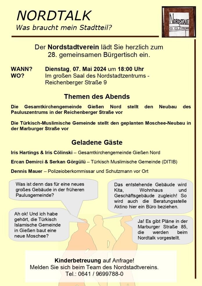 Am Dienstag den 7. Mai, Treffpunkt ist um 18 Uhr im Nordstadtzentrum (Reichenberger Straße 9), findet der 28. Bürgertisch Nordtalk statt. Zu dieser Sitzung sind alle Bewohner und Interessierten herzlich eingeladen.