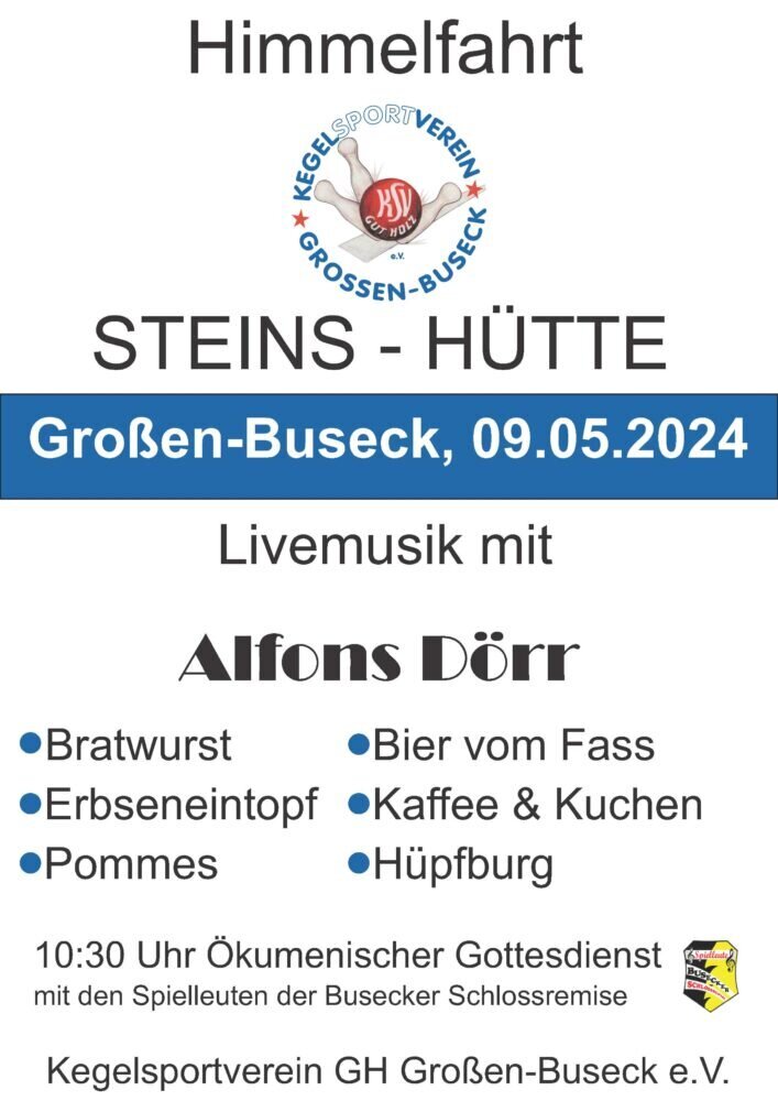 Es gibt auch noch ein weiteres Jubiläum, auf der Stein Hütte in diesem Jahr. Zum 40. Mal wir ein ökumenischer Gottesdienst dort ausgetragen. Bald ist es nun wieder soweit, der Kegelsportverein Gut-Holz Großen-Buseck lädt, am 9. Mai, zur Feier zu Himmelfahrt rund um die „Steins Hütte“ in Großen-Buseck ein. Die ganze Familie kann dort einen schönen Tag verbringen. Der Start ist bereits um 10.30 Uhr mit einem Ökumenischen Gottesdienst. Seitens der Kirche ist daher um 9:30 Uhr Treffen auf dem Anger, um gemeinsam zu „Steins Hütte“ zu wandern. Auf dem Weg dorthin sind unterschiedliche Stationen und Aktionen vorbereitet.. Beim Gottesdienst wirken dann wieder die Spielleute der „Busecker Schloßremise“ mit. Mit der Live Musik trägt „Alfons Dörr“ zur Stimmung bei.