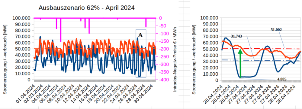 Bild 2: Verläufe von Stromerzeugung aus Ökoenergie und Stromverbrauch April 2030, hochgerechnet aus April 2024 entsprechend Planungsziel des BMWK für 2030 [4]; rechts Ausschnitt A mit größtem Reservebedarf.