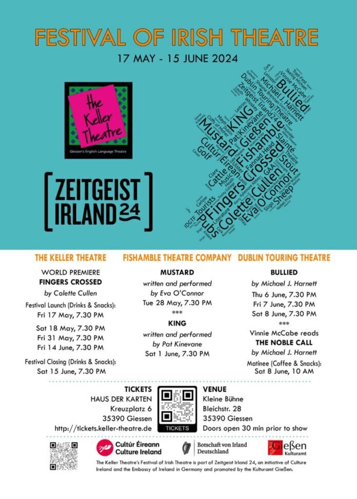 Das Keller Theatre Gießen, Deutschlands ältestes englischsprachiges Theater (gegründet 1958) veranstaltet in der Zeit vom 17. Mai bis 15. Juni 2024 ein Festival mit neuen irischen Bühnenstücken von u.a. zwei preisgekrönten Theatergruppen: Fishamble und der Dublin Touring Company.
