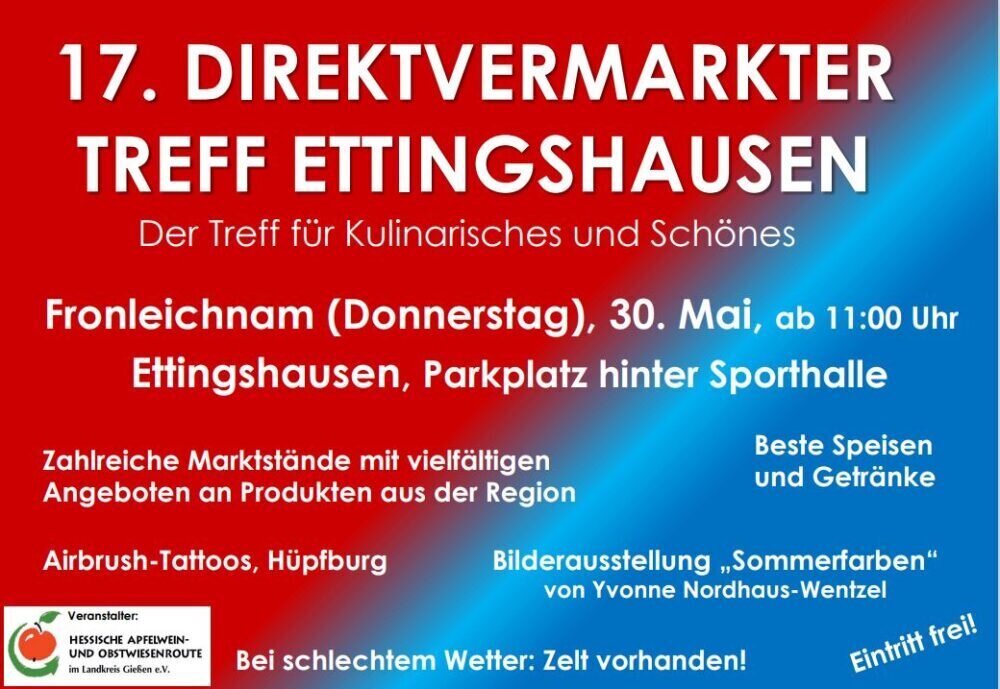 Am 30. Mai (Fronleichnam) findet zum 17. Mal der Direktvermarkter-Treff in Ettingshausen statt, und zwar von 11:00 bis 18:00 Uhr auf dem Parkplatz hinter der Sport- und Kulturhalle. Veranstalter ist die Hessische Apfelwein- und Obstwiesenroute im Landkreis Gießen e.V. Der Markt für Kulinarisches und Schönes bietet ein vielfältiges Angebot an Produkten aus der Region. Zudem besteht die Möglichkeit, einer Korbflechterin bei ihrer Arbeit zuzusehen und die Bilderausstellung „Sommerfarben“ von Yvonne Nordhaus-Wentzel zu besuchen. „Kunst Mensch Kirche“ eröffnet die Ausstellung bereits am 29. Mai um 17:00 Uhr in der Sport- und Kulturhalle. Der Eintritt ist frei.