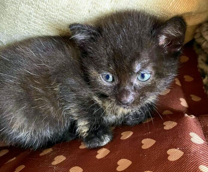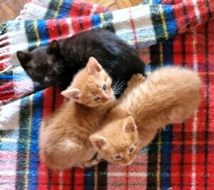 Dieser erschrak sich sehr, als nach einigen Tagen vier neu geborene Kitten im Körbchen lagen. Hiermit war er völlig überfordert und suchte Hilfe bei der Katzenfreundin.