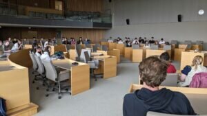 Jugend im Rathaus: Erstaunt betraten die Schülerinnen und Schüler den großen Sitzungssaal des Gießener Rathauses. Wo sonst die Stadtverordneten im großen Rund die Anliegen der Kommune besprechen, durften sie zur Begrüßung durch den Stadtverordnetenvorsteher Joachim Grußdorf Platz nehmen. Im Rahmen der Veranstaltungsreihe „Jugend im Rathaus“ waren die neunten Gymnasialklassen der August-Hermann-Francke-Schule zu diesem von Mara Geist (Büro für Kinder- und Jugendbeteiligung im Kinderschutzbund Gießen) organisierten Besuch an den Berliner Platz gekommen, um einen Einblick in die lokale Politik zu erhalten. Zunächst erkundeten sie im Rahmen einer Rallye das Rathaus. Die vorher im Fachunterricht Politik und Wirtschaft erarbeiteten Fragen konnten die 46 Jugendlichen dann in Gruppeninterviews den anwesenden Kommunalpolitikern der verschiedenen Parteien stellen.