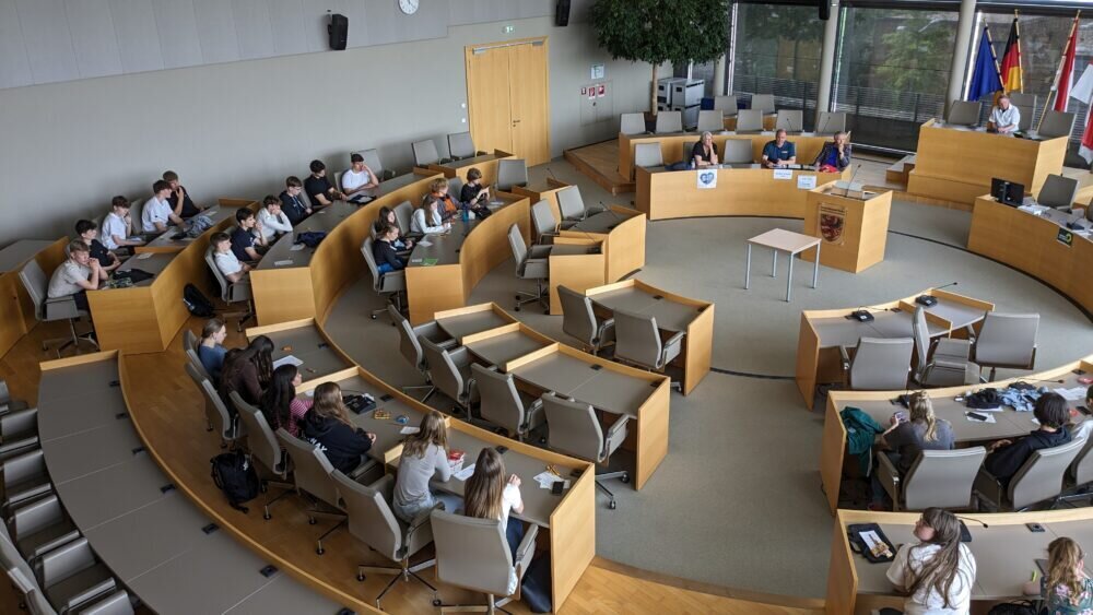 Beim anschließenden Plenum im Sitzungssaal (auch wieder mit fast allen im Stadtparlament vertretenen Parteien) ging es unter anderem um die Gießener Verkehrspolitik sowie die Frage nach der Integration von sozial Schwachen in die Gesellschaft. Die Schülerinnen und Schüler hatten auch kritische Fragen zur Kameraüberwachung im öffentlichen Raum, was den Parlamentariern Gelegenheit gab, ihre teils unterschiedlichen Ansichten zur öffentlichen Sicherheit in Gießen darzulegen. Die Heranwachsenden konnten also Fragen stellen, die ihrer Generation und Lebenssituation entsprachen, und hörten in jeder Runde interessiert zu, was jeweils eine Person pro Partei zu sagen hatte. Es wurden Gemeinsamkeiten registriert, die Schüler konnten aber auch Schwerpunkte der einzelnen Parteienvertreter ausmachen, welche sich über das Interesse der jungen Besucherinnen und Besucher im Parlament erfreut zeigten.