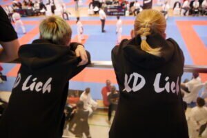 Beflügelt durch seinen zweiten Platz in Kata ging es für Ben direkt weiter im Kumite (Freikampf). Ohne Schwierigkeiten behauptete er sich in seinem Pool gegen alle anderen und zog ins Finale ein, bei dem er ebenfalls deutlich siegte. Mit dieser tollen Leistung kürt er sich bereits zum dritten Mal in Folge zum Hessenmeister seiner Altersklasse. Anschließend ging es noch zusammen mit seinen Kollegen Jayden Petermann, Florian Ulrich und Maximilian Alles im Kumite-Team an den Start, bei dem sich die vier direkt den Einzug ins Finale sicherten und dort mit guten Kämpfen ebenfalls den zweiten Platz erreichten. Bei den Mädchen ließ sich Emilia Alles und Sophie Hanitsch im Kumite in den Vorrunden nicht stoppen und standen sich somit im Finale gegenüber. Nach einem spannenden Kampf konnte sich Emilia behaupten und die Licherinnen belegten somit den ersten und zweiten Platz in der Kategorie U14. Und auch sie mussten beide direkt noch einmal an den Start: Zusammen mit Dina Guidera, die sich zuvor in ihrer Altersklasse im Kumite den 2. Platz im Einzel gesichert hatte, starteten sie noch als Kumite-Team und konnten auch hier den Hessenmeistertitel mit einem klaren Sieg und hervorragenden Leistungen erringen. In einem zweiten „Licher“-Finale standen sich Ben Eise und Leonard Ulrich im Kumite gegenüber. Ben gewann hier seinen ersten Titel bei einer Hessenmeisterschaft und Leonard belegte den zweiten Platz. Währenddessen erkämpften sich Florian Ulrich und Jayden Petermann auf einer anderen Kampffläche einen starken 3. bzw. 5. Platz in ihrer Altersklasse. Mit all diesen Erfolgen und einer umwerfenden Unterstützung untereinander und durch die mitgereisten Eltern machte das Licher Team diesen Tag für sich selbst und ihre Trainer zu einem unvergesslichen Erlebnis.