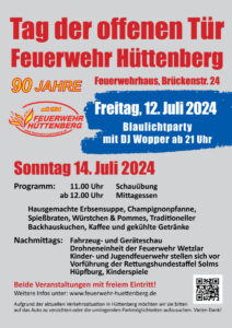 Der Tag der offenen Tür findet am Sonntag, den 14.07.2024, ab 11:00 Uhr, statt und steht ganz im Zeichen des Jubiläums. Mit einer Schauübung der Hüttenberger Einsatzabteilung beginnt der Tag, bevor das Mittagessen serviert wird. Egal ob hausgemachter Erbseneintopf, Spießbraten, Würstchen oder lieber fleischlos mit Pommes oder Champignonpfanne – es sollte für jeden etwas dabei sein. Staunen kann man über die Vorführung der Rettungshundestaffel Solms oder der Drohneneinheit der Feuerwehr Wetzlar. Es gibt eine Fahrzeug- und Geräteschau oder informieren Sie sich über die Arbeit der Hüttenberger Kinder- und Jugendfeuerwehr? Während die Gäste den frischen Backhauskuchen genießen, gibt es Kinderspiele und eine Hüpfburg für die kleinen Besucher.