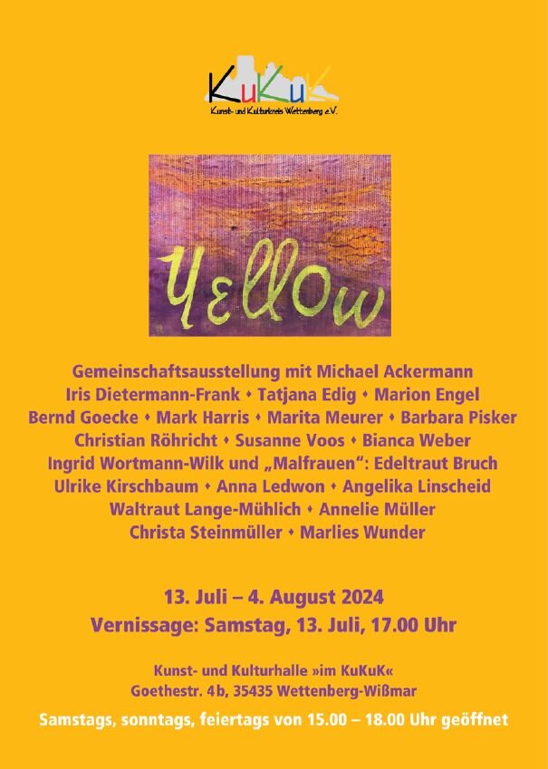 Am 13. Juli beginnt im Kukuk (Kunst- und Kulturkreis Wettenberg) eine neue Gemeinschaftsausstellung unter dem Thema „Gelb“. 20 Kunstschaffende, darunter 7 Gäste, haben eine reichhaltige Werkschau zusammengestellt, die sich dieser interessanten Farbe widmet.