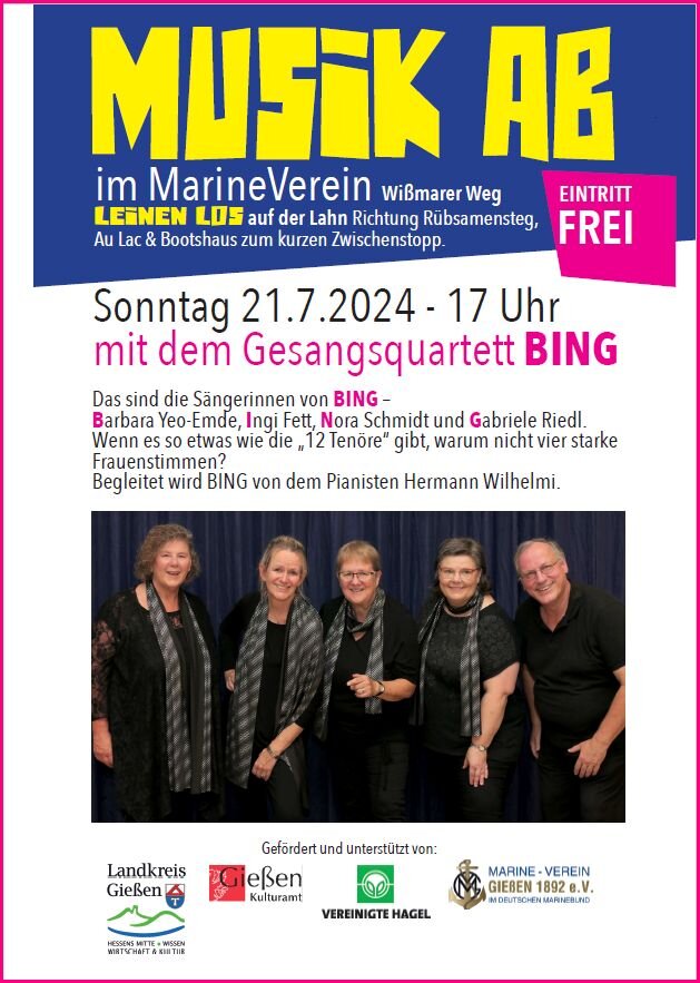 BING is back! Am Sonntag, den 21. Juli um 17 Uhr bei „MUSIK AB“ im MarineVerein an der Lahn, Wißmarer Weg 31, treten die vier starke Frauen auf, die zusammen einen Klang produzieren, der Gänsehaut pur verspricht.