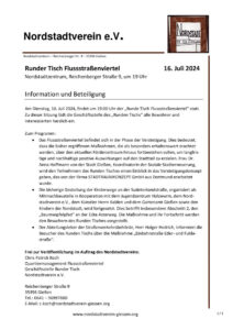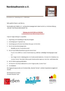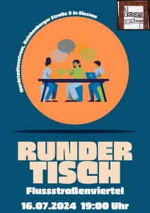 im Nordstadtzentrum Reichenberger Straße 9, 35396 in Gießen, findet am 16.07.2024 um 19 Uhr der nächste Runde Tisch statt. Bewohner und Bewohnerinnen der Nordstadt, des Flussstraßenviertels sowie alle Interessierten sind herzlich eingeladen, an dieser Sitzung teilzunehmen. Im Mittelpunkt dieser Zusammenkunft stehen aktuelle Planungen und Entwicklungen sowohl im Flussstraßenviertel als auch in der Nordstadt. Ein umfangreiches Spektrum an Themen wird diskutiert, und Sie sind eingeladen, Ihre Meinungen und Ideen einzubringen. Die genauen Themen finden Sie unter Tagesordnungspunkt 5 sowie der Information und Beteiligung.