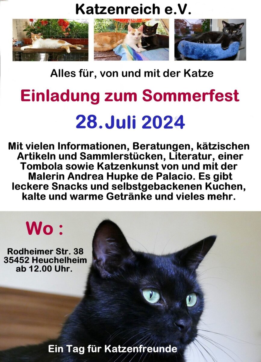 Es ist wieder soweit. Am 28.Juli ist wieder Sommerfest vom Katzenreich e.V. in Heuchelheim. Auch wieder wie in jedem Jahr kleine Katzen im Babyhaus die neugierig sind und ihre Besucher vom Balkon im Babyhaus begrüßen möchten. Wir freuen uns auf einen schönen Tag mit Katzenfreunden.