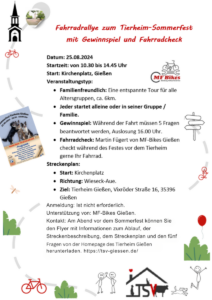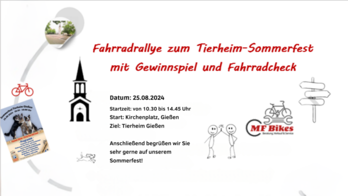 Am diesjährigen Sommerfest wird es eine Fahrradrallye von der Innenstadt zum Tierheim geben. Jeder kann dabei sein. Siehe Plakat!