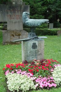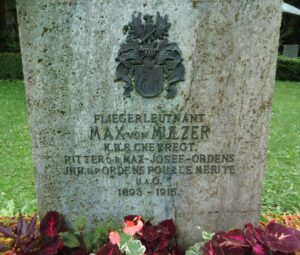 Keinen Steinwurf entfernt findet man auf dem Waldfriedhof in Memmingen wieder eine ganz andere Größenordnung von Grabdenkmal für den Fliegerhelden des Ersten Weltkriegs Max Ritter von Mulzer: