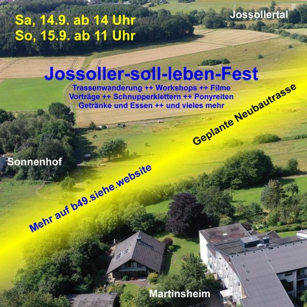 Ständig: Ponyreiten ++ Verkehrswendeausstellung ++ Infotische ++ Filmvorführung zum B49-Neubau ++ Erkennen und Verwenden von Kräutern aus dem Jossollertal ++ Führungen in die Umgebung