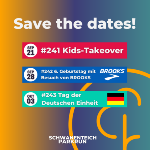 Eine Woche später, also am 28.9., feiern wir unseren 6. Geburtstag. Zu Besuch kommt Brooks, der Global Footwear Partner von parkrun in Deutschland, der mit Testschuhen, Snacks und guter Laune dabei sein wird! Natürlich wird es beim letzten parkrun im September auch die sonstigen Geburtstagsfeierlichkeiten wie Kuchen, Ballons & Sekt geben!