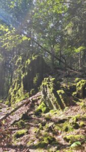 Vorbei an der Jausenstation Vogelschmiede führte ein Waldpfad zum Naturdenkmal „Bonifatiuskanzel“. Grün bemoost auf dunklem Stein ist er eine Klippe aus Basanit(vulkanisches Gestein) und erlaubt das Besteigen und Bestaunen von oben.