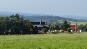18 Interessierte starteten in Hartmannshain auf dem Wanderparkplatz, zunächst ein Stück auf dem Vulkan-Radweg. Über einen Wiesenweg ging es bei herrlichem Spätsommerwetter stetig bergan mit weiten Blicken über das Umland.