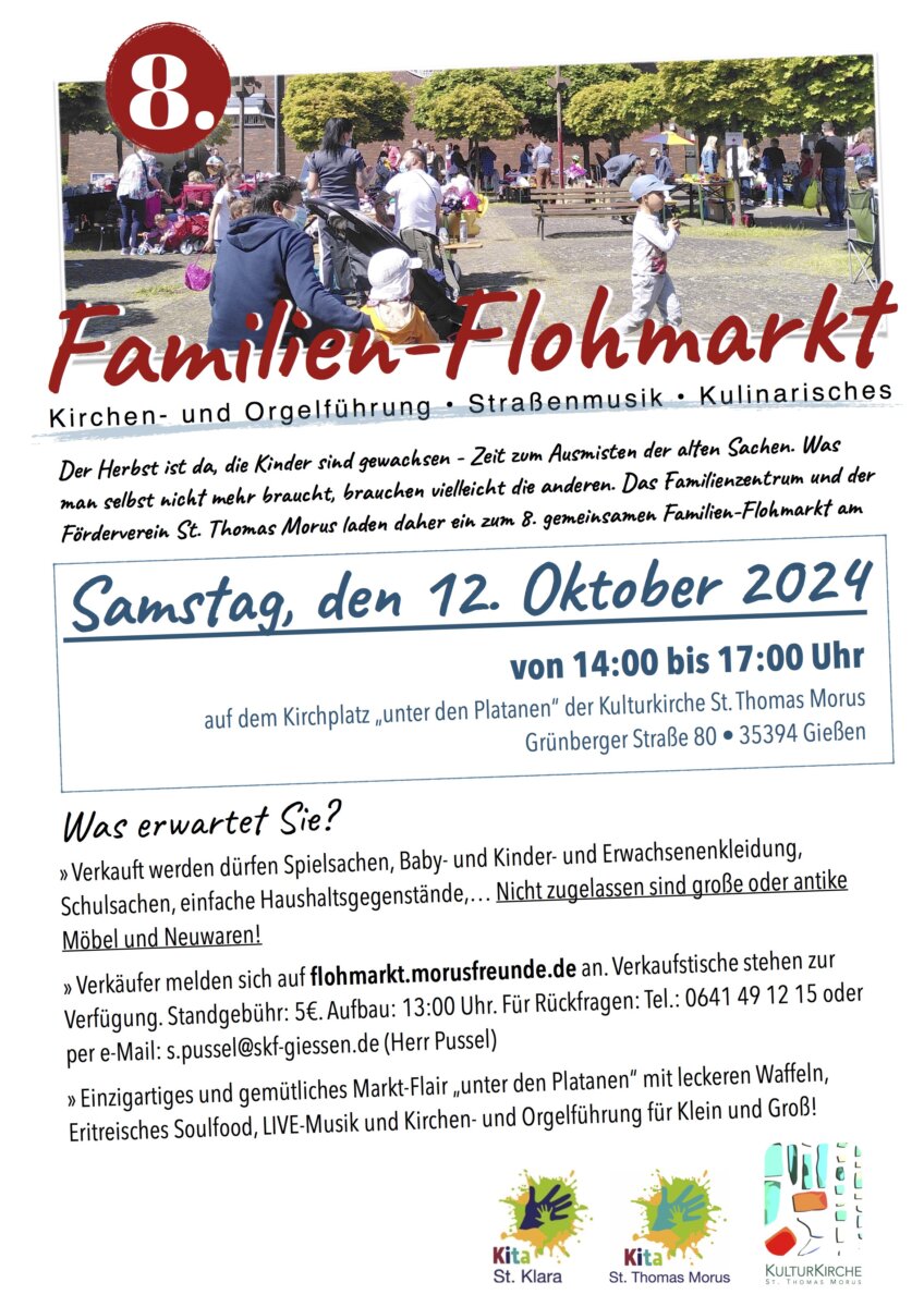 Der Herbst ist da, die Kinder sind gewachsen – Zeit zum Ausmisten der alten Sachen. Was man selbst nicht mehr braucht, brauchen vielleicht die anderen. Kita und Familienzentrum St. Thomas Morus und St. Klara laden zusammen mit dem Förderverein St. Thomas Morus ein zum gemeinsamen Familien-Flohmarkt am Samstag, den 12. Oktober 2024, in der Zeit von 14 bis 17 Uhr.