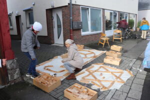 Personen mit Integration wecken. Die von den Schülern mit zahlreichen Infotafeln errichtete Gedenkstation beinhaltete daneben noch einige kreative Mitmachangebote. So konnten unter den Slogan <Nie wieder ist jetzt> eigene Gedanken zu Glauben, Krieg, Frieden und Rassismus an eine Pinwand angebracht werden. Aufmerksamkeit erhielten die auf der Straße angedeuteten Stolpersteine, deren Umfeld auch mit Straßenkreide bemalt werden konnte. Das Verlegen von Holzbausteinen ließ die verschiedensten Motive entstehen. Einen Einblick in die jüdische Sprache und Lebensgewohnheiten vermittelte eine entsprechende Infotafel. Großes Interesse fanden die Ausführungen der TKS-Lehrerin Christina Müller zu den 50 an der <Weiterführenden Schule Grünberg> unterrichteten und später vertriebenen bzw. teilweise ermordeten Schüler. Deren Porträts sollen bei einer bevorstehenden Ausstellung in Rabenau nochmals besonders herausgestellt und zugleich auch weitere Informationen über den Verbleib der einzelnen Schüler in Erfahrung gebracht werden. Besonders im Blickpunkt stand bei den Erläuterungen die in Grünberg wohnhafte jüdische Familie Buxbaum, die nach der Vertreibung im Jahr 1933 nach Jugoslawien im Jahr 1939 dann weiter nach Italien emigrieren musste. Pfarrer i. R. Hartmut Miethe zeigte mit seiner Präsentation <Das jüdische Leben im Mittelalter> auf. In einer Ansprache übermittelte er die Grüße des Grünberger Bürgermeisters Marcel Schlosser. Zugleich dankte er den Schülern und Lehrkräften Monika Hotte, Silvia Christen, Sabrina Hill, Christina Müller, dem Fotokurs der TKS, der <Schule gegen Rassismus> und allen an dieser Aktion Beteiligten für die großartige Idee und für die Durchführung dieser gemeinsamen Gedenkstation. Er sah trotz der Unterschiede und Probleme, dass alle Menschen zusammengehören. Die Friedensarbeit auf dem Globus sei sehr wichtig und könne einen Beitrag für die gute Zukunft bieten. Für die würdevolle musikalische Umrahmung sorgten einige Bläser des Posaunenchores der Evangelischen Kirchengemeinde Wieseck.