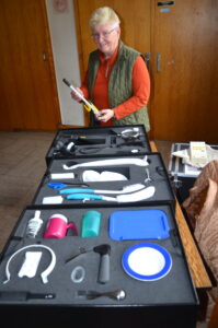 Anschließend begrüßte Seidler die Fachberaterin für „Barrierefreiheit“, Frau Bärbel Babutzka vom VdK Bezirk Gießen. In ihrem Vortrag zu der speziellen Thematik „Barrierefreiheit“ informierte Babutzka über verschiedene Hilfsmittel, die Menschen mit körperlichen Einschränkungen das tägliche Leben erleichtern und in bestimmten Situationen barrierefreies Handeln ermöglichen. Sie hatte einen großen Koffer voller Demonstrationsgegenstände mitgebracht und erklärte die Vorteile dieser speziellen Hilfsmittel. So gibt es Becher, die das Trinken erleichtern oder Essbestecke mit verdickten und besonders geformten Griffen, die bei eingeschränkten motorischen Fähigkeiten erstaunlich gute Hilfe und Unterstützung bieten.