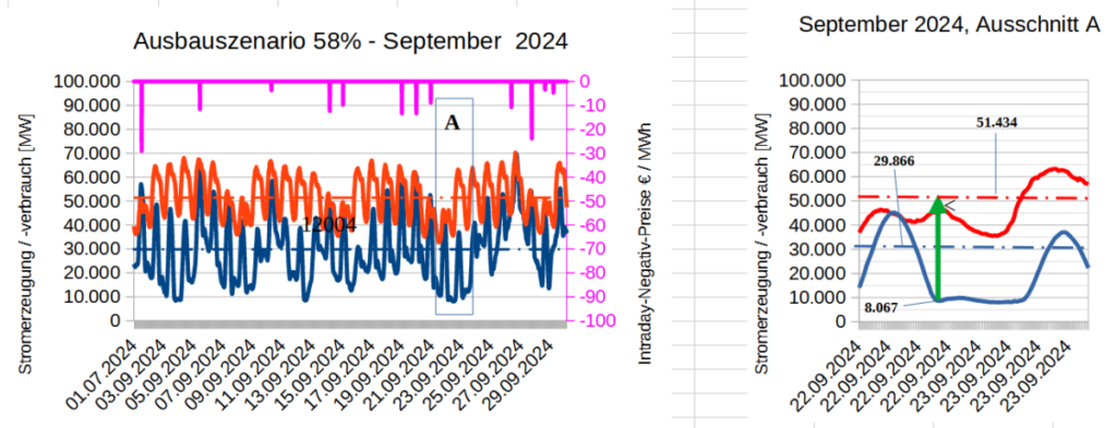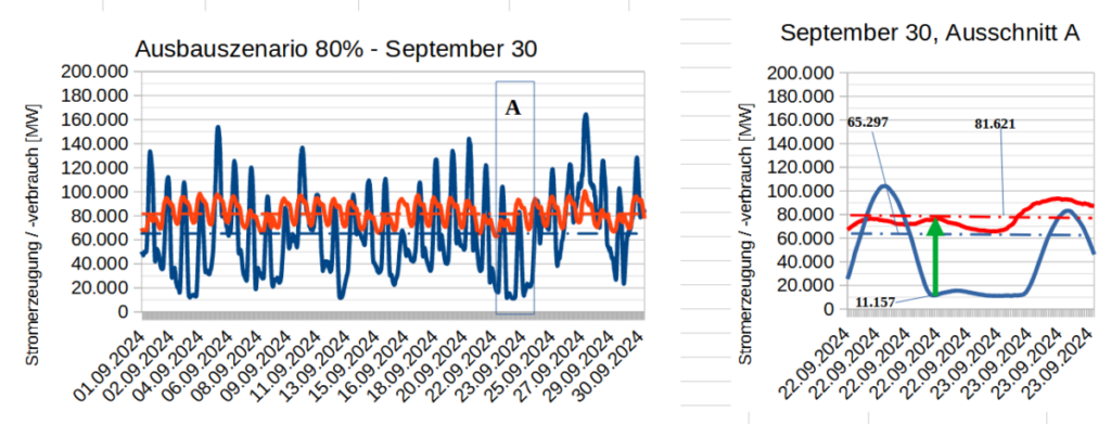 Bild 2: Verläufe von Stromerzeugung aus Ökoenergie und Stromverbrauch September 2030, hochgerechnet aus September 2024 entsprechend Planungsziel des BMWK für 2030 [4]; rechts Ausschnitt A mit größtem Reservebedarf (grüner Pfeil).