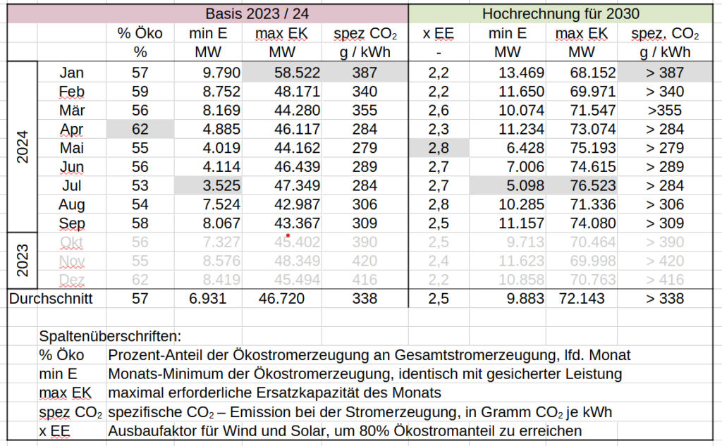 Der 80% – Anteil Anteil des Ökostroms am Verbrauch würde auf Basis der September-Daten mit dem Faktor 2,5 der installierten Erzeugungskapazität zwar planmäßig erreicht, aber nur als Durchschnittswert und, aufgrund der nicht aufgehobenen Volatilität, nur an 14 von 30 Tagen. Die immer noch erforderliche Ersatzstrombeschaffung stammt weiterhin überwiegend aus fossiler Kraftwerkstechnik, und auch weiterhin aus importiertem “Atomstrom”. Daher wird der in der Tabelle angegebene CO2 – Ausstoß bei sehr viel mehr als 309 Gramm je kWh Stromerzeugung liegen. Der genaue Wert in 2030 hängt vom dann erreichten Strommarktdesign ab. Fazit: Eine Ausbau der Ökostromerzeugung um den Faktor 2,5 durch Installation von Wind- und Solarkraftwerken, sofern sie überhaupt politisch durchsetzbar und ökonomisch realisierbar ist, kann den Treibhausgasausstoss nicht signifikant und nachhaltig verringern!