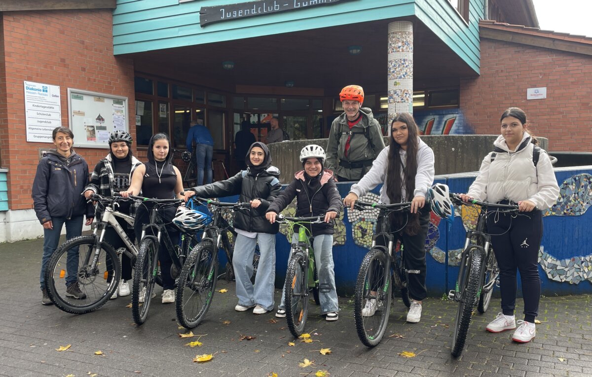 Andreas Schmidt betreute unterdessen die fortgeschrittenen Radfahrerinnen. Zunächst wurden Übungen vor dem Jugendclub gemacht, dann wurde eine weitere Strecke gefahren. Als der Regen immer stärker wurde und die Schülerinnen trotzdem noch nicht aufhören wollten, fuhr die gesamte Gruppe zum Schulhof der Alexander-von-Humboldt-Schule, um dort weitere Übungen unter den Dächern des Pausenhofs zu absolvieren.