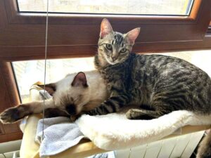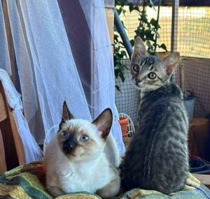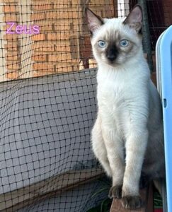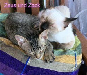 Thai Siam Zeus und sein Freund Zack, fünf Monate alt, sind “dicke Kumpel”! Wo der ist, ist der andere nicht weit! Sie spielen ausgelassen miteinander, kuscheln eng , und wenn der eine auf die Toilette geht, dann macht der andere es auch.