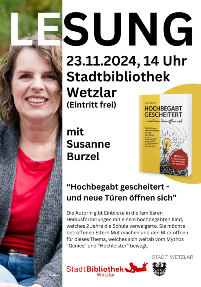 Die Lesung zum Buch „Hochbegabt gescheitert – und neue Türen öffnen sich“ findet am 23. November 2024 um 14 Uhr in der Stadtbibliothek Wetzlar statt. Der Eintritt ist frei.