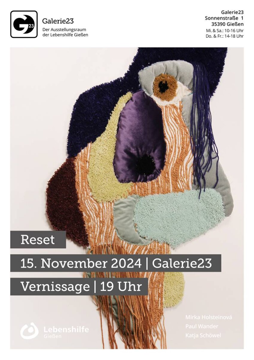 Gießen – Die Galerie23 der Lebenshilfe Gießen feiert ihre Wiedereröffnung! Aufgrund der Unbenutzbarkeit der Räumlichkeiten im Seltersweg war die Galerie im vergangenen Sommer vorübergehend geschlossen. Nach einer dreimonatigen Schließung und intensiver Standortsuche ist es nun so weit: Am 15. November um 19:00 Uhr öffnet die Ausstellung „Reset“ in den neuen Räumen in der Sonnenstraße 1 in Gießen ihre Pforten. Anwesend sind die Künstler*innen Paul Wander, Mirka Holsteinová und Katja Schöwel, die ihre Werke persönlich präsentieren werden.