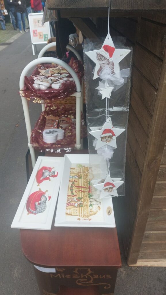 Der diesjährige Martinsmarkt in Heuchelheim lockte bei Bilderbuchwetter am Mittag und Nachmittag zahlreiche Besucher zum Bummeln und Einkaufen. Der Sonnenschein und das schöne Herbstwetter sorgten für gute Stimmung und langes Verweilen an den einzelnen Ständen, so auch am Stand von Katzenreich e.V., an dem sich viele Katzenfreunde einfanden. Das Interesse an den zu vermittelnden Katzen und der Tierschutzarbeit des Vereins war wie immer groß. Viele ausgefallene kätzische Dekoartikel oder die beliebten von Mitgliedern angefertigten Handarbeiten wechselten den Besitzer, manche wollten auch einfach nur eine Spende abgeben oder ein Schwätzchen halten und sich mit anderen Katzenbesitzern austauschen. Besonders schön ist es für die Mitglieder des Vereins, wenn glückliche Katzenbesitzer von Katzenreich-Katzen Fotos von den ehemaligen Schützlingen des Vereins im neuen Zuhause präsentieren. So war auch in diesem Jahr der Stand von Katzenreich e.V. ein beliebter Treffpunkt für Katzenfreunde. Am Abend boten die schön beleuchteten Stände ein stimmungsvolles Bild des Marktes für alle Besucher und es endete ein schöner und erfolgreicher Tag.