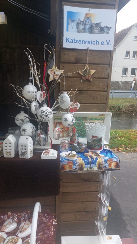 Der diesjährige Martinsmarkt in Heuchelheim lockte bei Bilderbuchwetter am Mittag und Nachmittag zahlreiche Besucher zum Bummeln und Einkaufen. Der Sonnenschein und das schöne Herbstwetter sorgten für gute Stimmung und langes Verweilen an den einzelnen Ständen, so auch am Stand von Katzenreich e.V., an dem sich viele Katzenfreunde einfanden. Das Interesse an den zu vermittelnden Katzen und der Tierschutzarbeit des Vereins war wie immer groß. Viele ausgefallene kätzische Dekoartikel oder die beliebten von Mitgliedern angefertigten Handarbeiten wechselten den Besitzer, manche wollten auch einfach nur eine Spende abgeben oder ein Schwätzchen halten und sich mit anderen Katzenbesitzern austauschen. Besonders schön ist es für die Mitglieder des Vereins, wenn glückliche Katzenbesitzer von Katzenreich-Katzen Fotos von den ehemaligen Schützlingen des Vereins im neuen Zuhause präsentieren. So war auch in diesem Jahr der Stand von Katzenreich e.V. ein beliebter Treffpunkt für Katzenfreunde. Am Abend boten die schön beleuchteten Stände ein stimmungsvolles Bild des Marktes für alle Besucher und es endete ein schöner und erfolgreicher Tag.