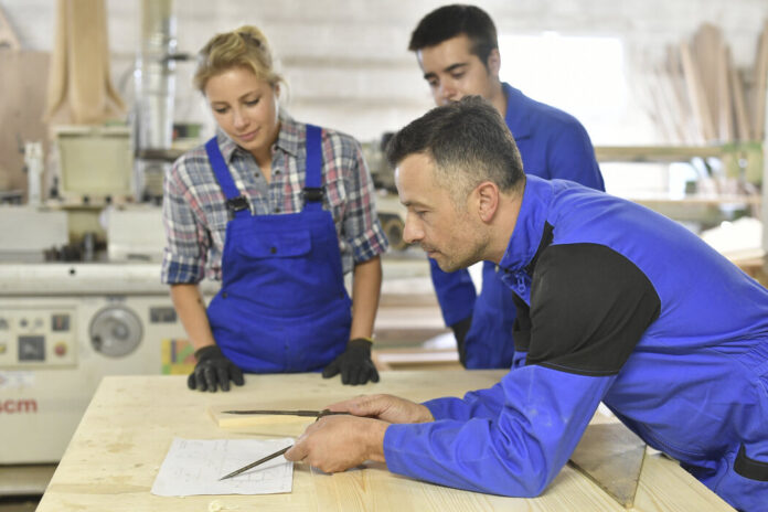 Ausbilder mit Zirkel erklärt zwei Auszubildenden einen Bauplan