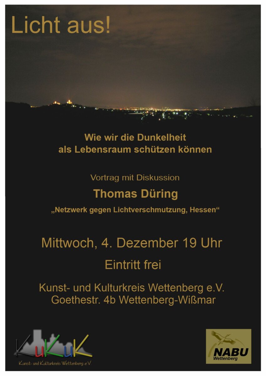 Fachliche und rechtliche Hintergründe dazu wird Thomas Düring bei einem Vortrag im KuKuK Wettenberg erläutern. Er ist Mitbegründer des „Netzwerks gegen Lichtverschmutzung Hessen“ und Vorsitzender der Volkssternwarte Mittelhessen. Thematisiert wird auch, wie man möglichst schonend für Tier und Mensch beleuchtet. Der Vortrag wird veranstaltet von NABU und KuKuK findet statt in der Kunst- und Kulturhalle in Wettenberg-Wißmar, Goethestr. 4b, Eintritt frei. Der Vortrag ist eingebettet in die Ausstellung „Licht und Schatten“, die vom 23.11. bis 15.12. jeweils an den Wochenenden zu sehen ist.