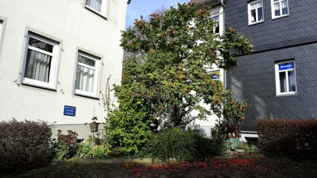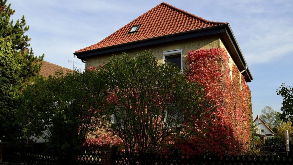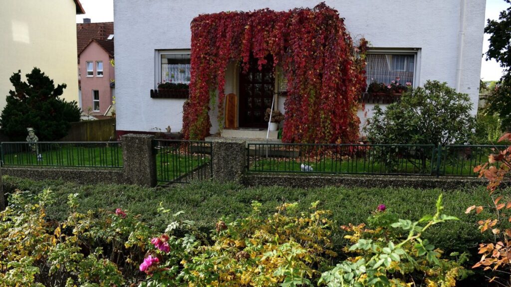 “nicht verputzt” – aber berankt – ein Schmuckwerk zum Herbst; Wo: GartenstraßeWunderschöner Vorgarten mit Pampasgras ect., wo: Konrad-Adenauer-Straße