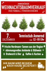 Wie in den vergangenen Jahren wird der Fußball-Förderverein (FÖV) des SV 1945 Annerod am 07.12.2024 auf dem Gelände des Tennisclubs Annerod wieder den Anneröder Weihnachtsbaumverkauf veranstalten.