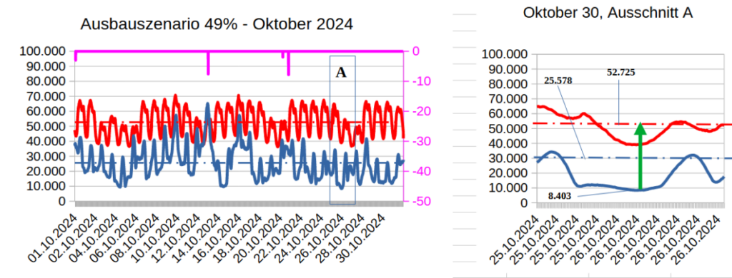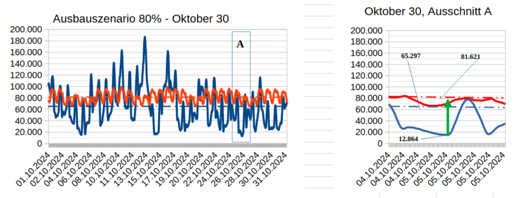 Bild 2: Verläufe von Stromerzeugung aus Ökoenergie und Stromverbrauch Oktober 2030, hochgerechnet aus Oktober 2024 entsprechend Planungsziel des BMWK für 2030 [4]; rechts Ausschnitt A mit größtem Reservebedarf (grüner Pfeil).