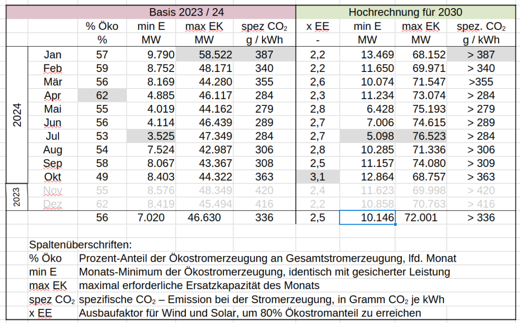 Der 80% – Anteil des Ökostroms am Verbrauch würde durch Ausbau der aktuellen erneuerbaren Erzeugungskapazität um den Faktor 3,1 zwar planmäßig erreicht, aber als Durchschnittswert und, aufgrund der nicht aufgehobenen Volatilität, nur an 14 von 31 Tagen. Die immer noch erforderliche Ersatzstrombeschaffung stammt weiterhin überwiegend aus fossiler Kraftwerkstechnik, und auch weiterhin aus importiertem “Atomstrom”. Daher wird der in der Tabelle angegebene CO2 – Ausstoß bei sehr viel mehr als 363 Gramm je kWh Stromerzeugung liegen. Der genaue Wert in 2030 hängt vom dann erreichten Strommarktdesign ab.