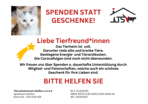 Wir danken Ihnen im Voraus für Ihren Einsatz und Großzügigkeit. Jeder Beitrag hilft uns, die Pflege und Unterstützung der Tiere in unseren Heimen zu verbessern und ihren Aufenthalt bei uns so angenehm wie möglich zu gestalten.