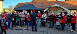 Holzheim – Schön wie das Wetter war der Weihnachtsmarkt in der Holzheimer Dorfmitte rund um die „Kulti“, zu dem der Gesangverein Harmonie Holzheim eingeladen hatte. Die Weihnachtsmarktgäste wurden von der „Harmonie“ unter Leitung ihres Dirigenten Matthias Hampel um 14 Uhr mit Weihnachtsliedern begrüßt.
