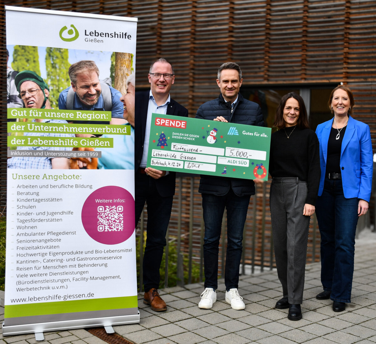 Tobias Ruhland (2.v.l., Managing Director ALDI SE & Co. KG Butzbach) überreicht dem Lebenshilfe-Geschäftsführungsteam, bestehend aus Dirk Oßwald (links, Vorstand), Linda Hauk (2.v.r.) sowie Dr. Rebecca Neuburger-Hees, eine vorweihnachtliche Überraschung in Form eines symbolischen Spendenschecks.