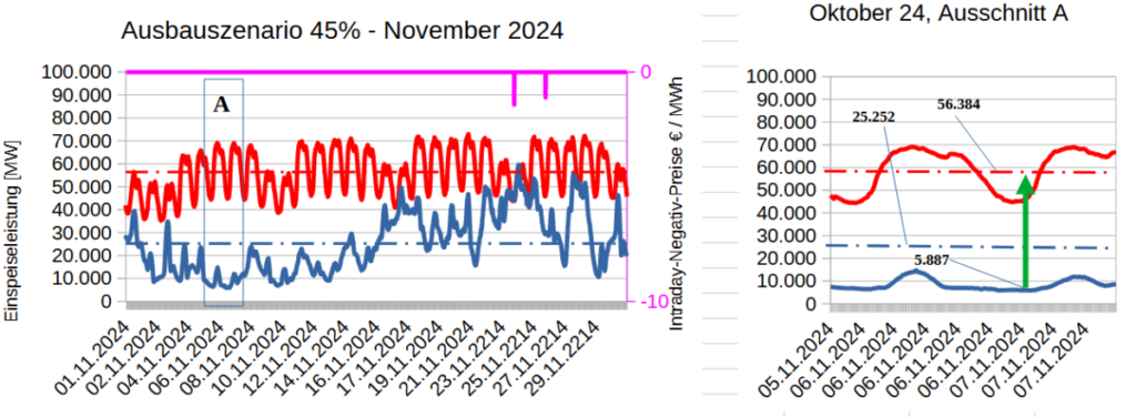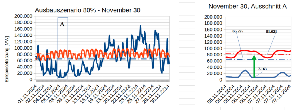 Bild 2: Verläufe von Stromerzeugung aus Ökoenergie und Stromverbrauch November 2030, hochgerechnet aus November 2024 entsprechend Planungsziel des BMWK für 2030 [4]; rechts Ausschnitt A mit größtem Reservebedarf (grüner Pfeil).