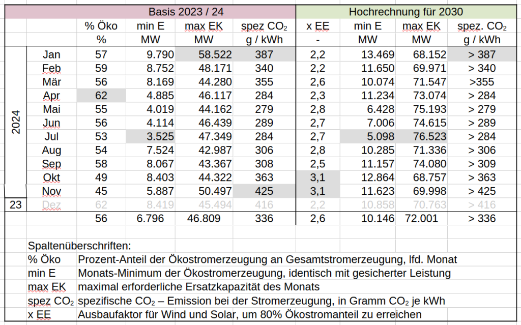 Der 80% – Anteil des Ökostroms am Verbrauch würde durch Ausbau der aktuellen erneuerbaren Erzeugungskapazität um den Faktor 3 zwar planmäßig erreicht, aber als Durchschnittswert und, aufgrund der nicht aufgehobenen Volatilität, nur an 14 von 30 Tagen. Die immer noch erforderliche Ersatzstrombeschaffung stammt weiterhin überwiegend aus fossiler Kraftwerkstechnik, und auch weiterhin aus importiertem “Atomstrom”. Daher wird der in der Tabelle angegebene CO2 – Ausstoß bei sehr viel mehr als 425 Gramm je kWh Stromerzeugung liegen. Der genaue Wert in 2030 hängt vom dann erreichten Strommarktdesign ab.