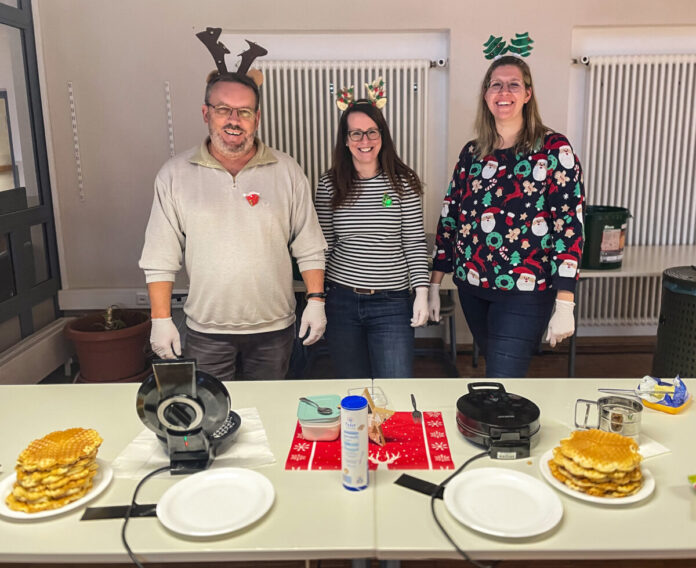 Der „Bewegte Adventskalender“ ist mehr als nur eine Ansammlung von Türchen zum Öffnen. Hinter jedem Tag verbirgt sich eine kleine Veranstaltung, die die Mitarbeitenden in verschiedenen Abteilungen gemeinsam erleben. Die Bandbreite der Aktivitäten reicht von einer stimmungsvollen Wanderung zum Wißmarer See mit Picknick, über kreative Adventsbasteleien und Adventsschminken, bis hin zum humorvollen und leckeren Bau von Lebkuchenhäusern. Ein weiteres Highlight des Kalenders: Das Leitungsteam stellte sich auch dieses Jahr wieder hinters Waffeleisen und kredenzte für die gesamte Werkstatt traditionelle Waffeln – eine süße Überraschung, die sich niemand entgehen ließ.