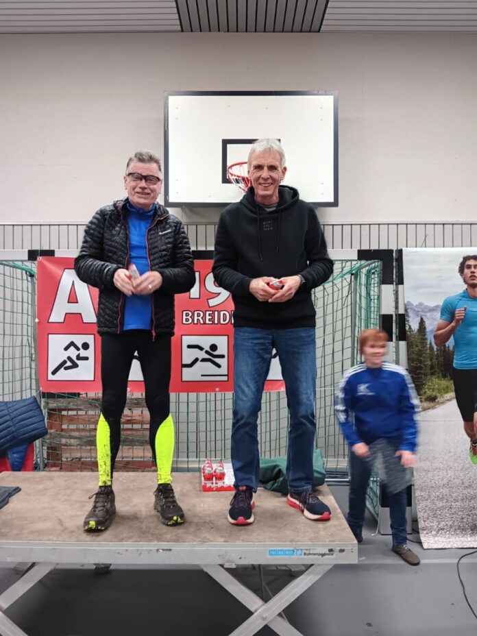 Heinz Barfuss vom TSV Krofdorf-Gleiberg, Sieger der Altersklasse M70 (links) und der Zweitplatzierte, Elmar Stein (100 Marathon Club)