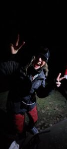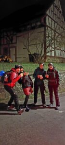 Die dritte Runde wartete mit -6°C; das Trinken aus mitgeführten Flaschen gestaltete sich schwierig. Eiskristalle möchte man nach 50 km und leichter Fröstelei nun wirklich nicht trinken. Also freute sich die mittlerweile leise gewordene Gruppe über support. Silja Römers Sohn folgte dem livetrack von komoot und brachte um 2 Uhr Kaffee auf die Strecke nach Flensungen und damit kamen auch die Lebensgeister zurück; Merlau, Kirschgarten, Ilsdorf, Stockhausen und Weickertshain warteten – 40 km waren noch zu meistern.