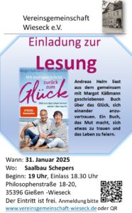 Die Vereinsgemeinschaft Wieseck e.V. lädt am Freitag, 31. Januar 2025 um 19 Uhr herzlich zu einer Lesung mit Andreas Helm ein. Zusammen mit Margot Käßmann hat er das Buch „Mit mutigem Schritt zurück zum Glück“ verfasst und liest daraus. Es ist ein Buch voller mutmachender Worte darüber, wie uns das Leben immer wieder überraschen kann. Die Lesung findet im Saalbau Schepers, Philosophenstraße 18-20 in Gießen-Wieseck statt. Da die Plätze begrenzt sind, ist eine Anmeldung erforderlich unter www.vereinsgemeinschaft-wieseck.de/#reservierung. Einlass ist ab 18.30 Uhr.