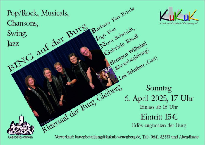 Die Grippe- bzw. Erkältungswelle ist voll im Gange. Leider hat sie ein paar der BING-Sängerinnen erwischt. Deswegen muss das geplante Konzert am 8. Februar im Rittersaal der Burg Gleiberg verschoben werden. Der Ersatztermin ist Sonntag, den 6. April um 17 Uhr. Die bereits bezahlten Kartenbestellungen behalten ihre Gültigkeit. Für Rückfragen ist das KuKuK-Team erreichbar telefonisch unter 01573 335 6982 oder 0641 870159, per Email über kartenbestellung@kukuk-wettenberg.de, Stichwort BING.